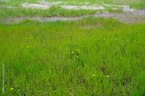 Städtisches Brachland mit Gras und Löwenzahn in Berlin