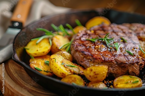 Steak and golden potatoes on rustic wooden table