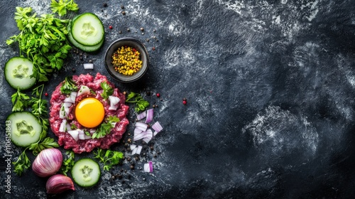 Steak Tartare: Classic French Dish with Beef, Raw Egg Yolk, and Pickled Cucumber. Top View on Fresh Plate