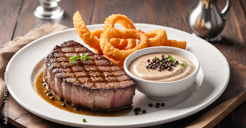 Steak with peppercorn sauce and onion rings, parsley