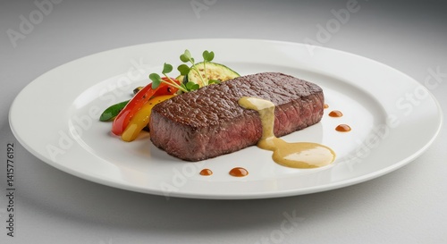 steak, meat, beef, sauce, vegetable, food, plate, meal, dinner, lunch, epicure, culinary, cookery, eatery, cooked, grilled, delicious, appetising, presentation, white, garnish, pepper, pea, yellow, brown, juicy, cut, portion, serving, fine dining, elegant, fresh, healthy, diet, protein