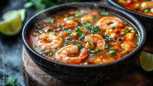 steam rises from a delectable bowl of tom yum soup filled with prawns vegetables and aromatic spices accompanied by lime wedges and herbs on a rustic wooden background
