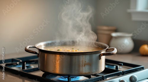 Steam rises from a pot of soup simmering on a gas stove in a cozy kitchen during late afternoon