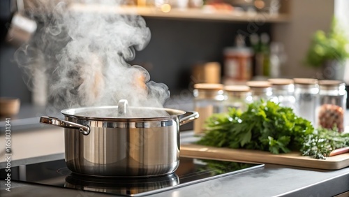 cooking, kitchen, pot, steam, food, boiling, stove, cookware, stainless, steel, culinary, preparation, meal, dinner, lunch, ingredient, receipe, homemade, fresh, vegetable, herb, parsley, thyme, bay, leaf, cutting, board, countertop, jar, spice, indoor, home, domestic, lifestyle, nourishment, healthy, diet, cookery, gastronomy, appetising, aroma, favor, delicious, nourishment, utensil, equipment, modern, contemporary