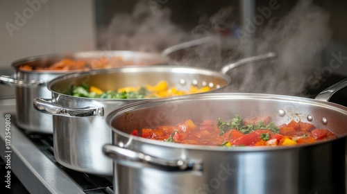 Steam rises from colorful pans on a stovetop, hinting at a busy kitchen where fresh ingredients blend into vibrant dishes.