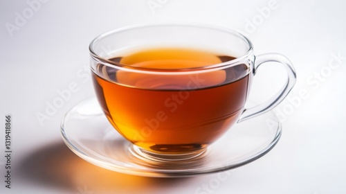 Steam rises gently from the freshly brewed tea, inviting warmth and comfort. The transparent cup showcases the rich amber hue, promising a moment of tranquility