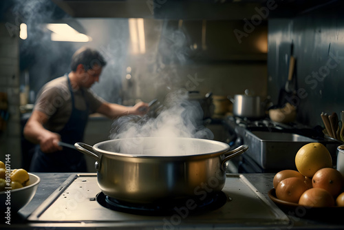 Steam rising from a pot on the stove as a cook stirs ingredients for a savory dish in a bustling kitchen,8k Ultra HD, high illustration