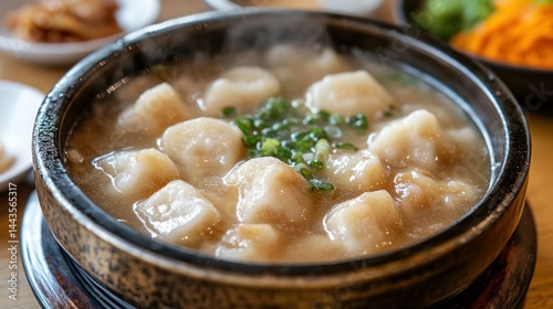 Steamed dumplings in a savory broth. A steaming bowl of dumplings, perhaps soup dumplings, bathed in a light, flavorful broth. Garnished with green onions