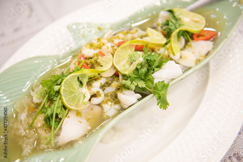 asian, asian cuisine, beverage, chili, cooked, cooking, cookery, cuttlefish, delicious, diet, dinner, dish, eat, fish, food, fresh, garlic, epicure, green, health, healthy, herb, hot, lemon, lime, lunch, meal, menu, octopus, plate, eatery, salad, sauce, sea, seafood, service, sour, spicey, squid, steam, steamed, stuffed, tasty, thai, thai food, traditional, vegetable, white