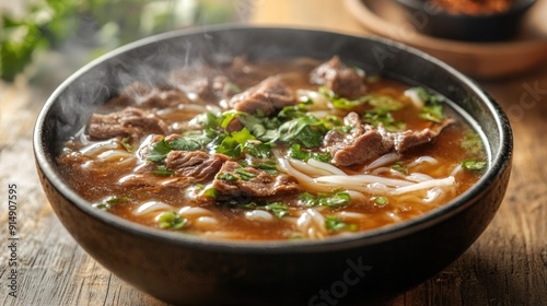 soup, noodle, beef, bowl, steaming, food, broth, asian, cookery, dinner, lunch, delicious, savoury, warm, comfort, fresh, herb, cilantro, spicey, flavorful, healthy, alimentary, tasty, homemade, epicure, eatery, dining, culinary, gastronomy, photo, still, life, close, up, macro, wooden, table, background, dark, brown, white, green