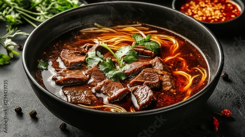 Steaming bowl of beef soup noodles with soy-marinated beef slices. --chaos 20 --ar 16:9 --quality 2 --v 6.1 Job ID: 4e16db83-df58-45a0-838b-44cb1342432a