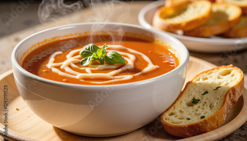 Steaming bowl of tomato soup with basil and bread for food blogs, recipe websites, culinary presentations, catering menus, cooking classes, and kitchen-themed stationery