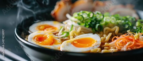 Steaming bowls of ramen explode with flavors from rich broth, tender noodles, and an array of toppings like softboiled eggs and sliced pork with copy space