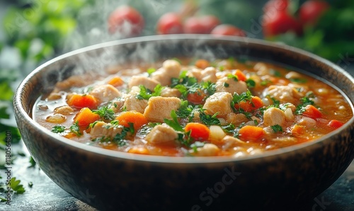 chicken, soup, stew, carrot, parsley, hot, steamy, delicious, comfort, food, meal, dinner, lunch, homemade, healthy, tasty, savoury, warm, hearty, vegetable, broth, tomatoes, onion, herb, spice, bowl, wooden, rustic, autumn