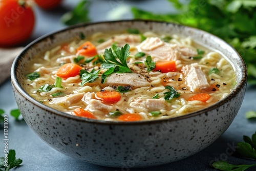 Steaming chicken noodle soup garnished with fresh parsley in bowl