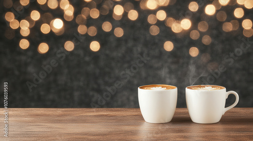 Steaming coffee cups on wooden table create cozy atmosphere with warm bokeh lights in background, perfect for relaxation and enjoyment