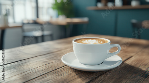 steaming cup of coffee on wooden table, showcasing latte art, creates cozy atmosphere in cafe setting