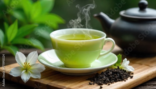 Steaming cup of jasmine green tea, delicate white blossoms visible in the leaves, next to a teapot and a scattering of loose tea leaves on a bamboo mat , teapot, oriental, refreshing