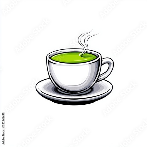 green tea, matcha, teacup, saucer, hot drink, beverage, illustration, digital artwork, white background, simple, clean, minimalist, steaming, warm, cosy, relaxing, retro, vintage, pixelated, graphic design, design element, cute, adorable, graphic, art, design, image, picture, drawing, painting, artwork, clip art