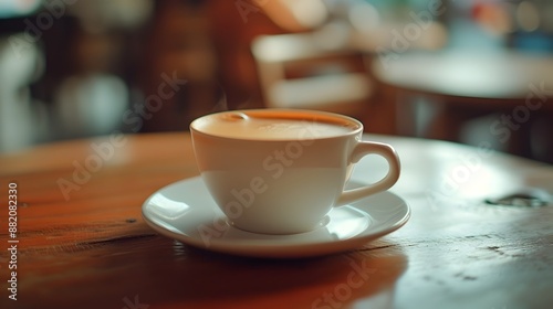 Steaming Hot Coffee Cup on Wooden Table in Cozy Caf Setting