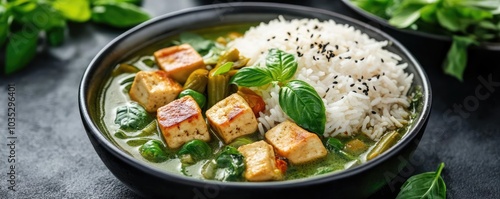 Steaming, spicy vegan green curry with tender chunks of tofu, bamboo shoots, and fresh basil, served with jasmine rice