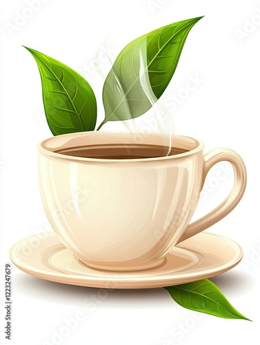 Steaming teacup, green leaves, white background; perfect for beverage ads