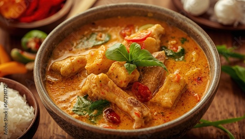 thai, green, curry, chicken, bamboo, shoot, basil, coconut, sauce, creamy, fragrant, steaming, red, chili, slice, jasmine, rice, warm, tropical, vibrant, colours, garnish, herb, fresh, exotic, meal, dinner, dish, bowl, traditional, spicey, aromatic, soft, light, plated, cultural, authentic, flavorful, cooked, serving, appetising