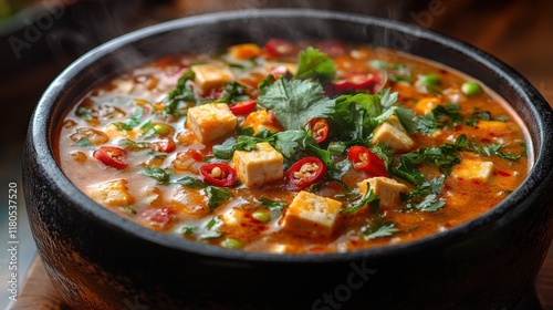 spicey, tofu, curry, stew, vegetable, soup, cilantro, chili, pepper, pea, tomatoes, sauce, hot, bowl, food, dish, cookery, dinner, lunch, vegan, vegetarian, healthy, delicious, aromatic, flavorful, savoury, warm, steam, cooking, receipe