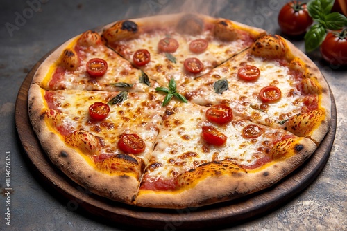 pizza, cheese, crust, tomatoes, basil, olive oil, herb, rustic, decor, food, italian, cookery, epicure, delicacy, meal, dish, cooking, baking, oven, steam, aroma, savoury, crisp, bubbling, drizzle, sprinkle, slice, ingredient, edible, delectable, tempting, deliciously, mouth-watering, culinary, gastronomy, deliciously