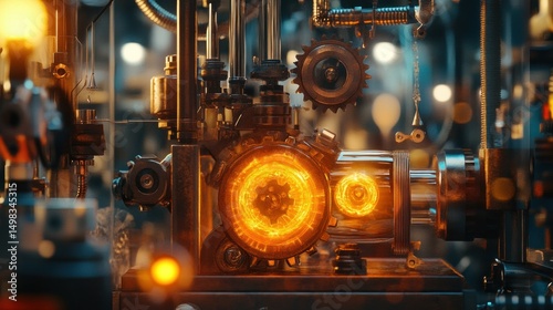 machine, steam, glowing, engine, core, metallic, gear, pipe, industrial, retro, fantasy, science, tech, mechanism, copper, bronze, metal, vintage, bright, light, warm, fire, energy, power, circular, amber, orange, dark, blurred, background, detailed, sharpened, complex, design, art, illustration, three-dimensional, render, mechanical, innovation, invention, future, technology, system, process, intricate, machinery, engineering