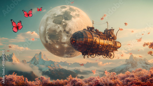 Steampunk Airship Soaring Over a Fantasy Landscape with a Large Moon and Butterflies