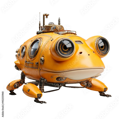 frog, submarine, underwater, vehicle, robot, machine, mechanical, gear, cog, brass, bronze, gold, yellow, orange, eye, cute, whimsical, fantasy, science fiction, futuristic, invention, innovation, technology, engineering, design, artwork, illustration, digital artwork, creative, unique, quirky, charming, adorable, character, mascot, transportation, exploration, adventure, retro, vintage, antique, detailed, intricate, texture, polished