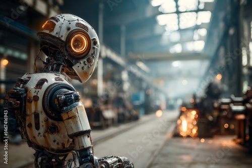 Steampunk Robot Observes Welding Operation in Dimly Lit Industrial Environment with Metal Structures and Bright Sparks