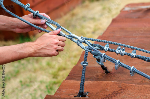 steel cables fastening safety harness. equipment for rope park