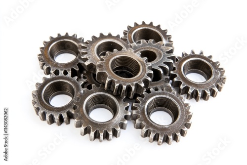 Steel Wheels Detached: Metal Machine Components on a Clean White Canvas