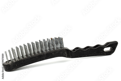 Steel wire brush with handle from black plastic for cleaning and polishing hard or metal equipment, isolated on white background