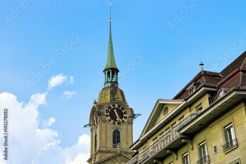 holy, spirit, church, clock, tower, church steeple, church steeple, bern, capital, switzerland, swiss, europa, european, city, town, old, center, central, street, downtown, city landscape, architecture, house, building, exterior, historic, historical, landmark, view, travel, tour tourism, urban, summer, mediaeval, ancient, famous