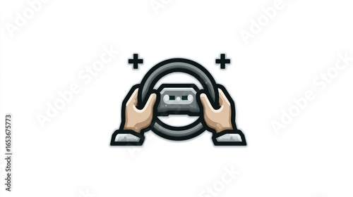 Steering wheel held by hands, car dashboard icon, transportation symbol isolated