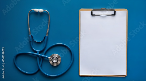 stethoscope and blank clipboard isolated on blue background
