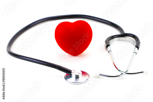 Stethoscope around a red rubber heart on a white background; concept of health, healthy heart, or cardio examination