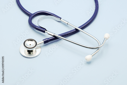 Stethoscope for doctor checkup on light blue background with copy space, healthcare and medical concept.