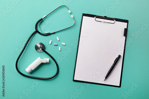 Stethoscope in doctors desk with tablet, pen, inhaler and pills