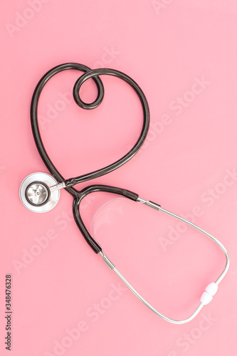 Stethoscope in the shape of heart on pink background Medicine concept, symbolic association with love, cardiology