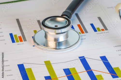 Stethoscope on charts and graphs spreadsheet paper, Finance, Account, Statistics, Investment, Analytic research data economy and Business company concept.