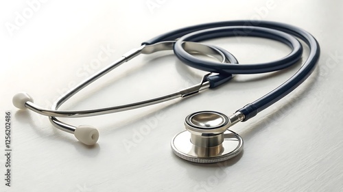 Stethoscope resting on a stack of prescription pads on a clean modern desk, with soft light creating a clinical yet tidy atmosphere in a healthcare setting.