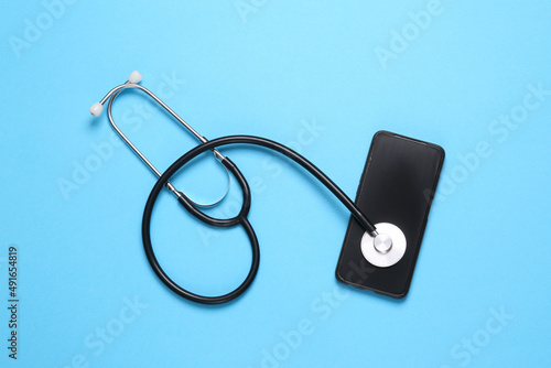 Stethoscope with a smartphone on a blue background. Smartphone diagnostics and repair. Appliance service or medical concept. Top view