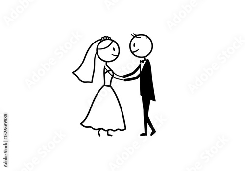 Stick figure bride and groom holding hands in wedding attire on a white background drawing design