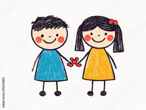 Stick Figure Clipart of a Happy Stick Family Boy and Stick Girl Sharing a Toy Together on a Clean White Background Conceptual Image Representing Childhood Friendship Sharing and Family Togetherness