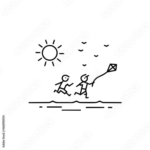 Stick figures running on beach with kite under sun and birds in simple line art illustration style