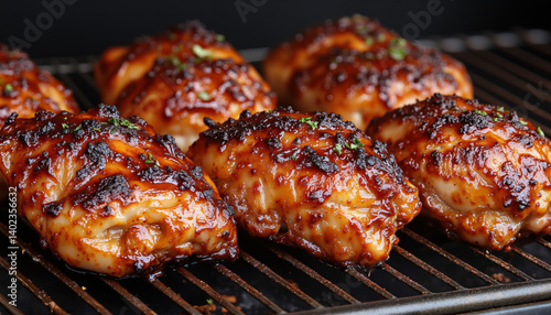 Sticky BBQ Chicken Thighs Grilling with Thick Sauce and Crispy Charred Bits – Close-Up of Glazed Grilled Chicken Perfection